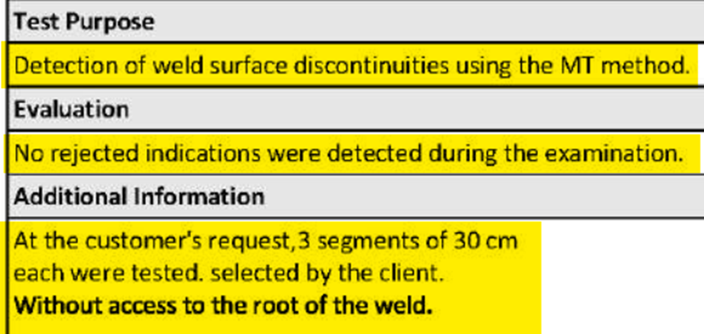 כל הנתונים הללו הסתמכו על בדיקות אל הרס רדיוגרפיות שנועדו לאתר פגמים בשורש הריתוך, בדו”חות לא הסתמכו על בדיקות חלקיקים מגנטיות שכן בדיקה זו אינה רלוונטית לאיתור הפגם הנטען.