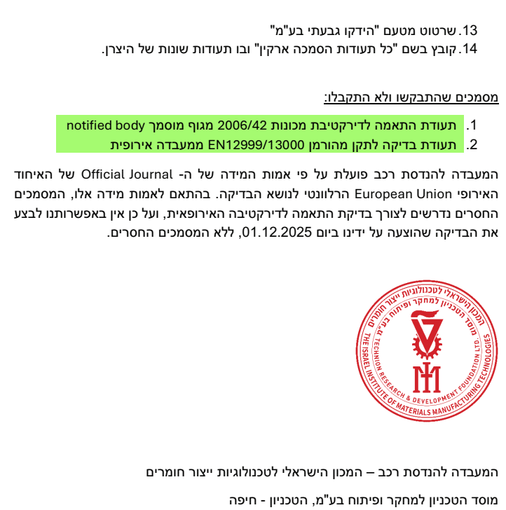 לא הוצגה תעודת בדיקה מטעם Notified Body אירופאי, לא הוצג דו”ח בחינה הנדסית מלא לפי EN 12999/EN 13000, ולא הוצג תיק טכני או תיק מוצר המאשר עמידה בדרישות הבטיחות המהותיות ולא הוצגו אישורים לעמידה בדירקטיבה האירופאית.