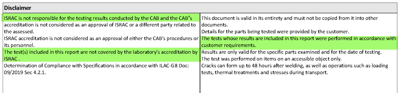 מעבדות אלו מתחכמות ורושמות כי התעודה היא לדרישת הלקוח או שאינן תחת הסמכת הרשות להסמכת מעבדות מעבדה שתתן דוח כזה לוקחת על עצמה את כל האחריות משום שאני רואה בכך הנפקת מסמך למראית עין. חובה של מעבדות אלו לרשום בדוחות אלו את המשמעות המשפטית, בעברית בצבע אדום ובולט מה המשמעות שהתעודה אינה ניתנת תחת הסמכת הרשות להסמכת מעבדות וכי למעשה המשמעות היא שהבדיקה לא בוצעה לפי התקינה הרלוונטית הנדרשת לסוג הבדיקה אלא לפי בקשת הלקוח זה חייב להיות רשום באופן מפורש בדוח, מעבדה שלא תרשום זאת כל האחריות תוטל עליה.
